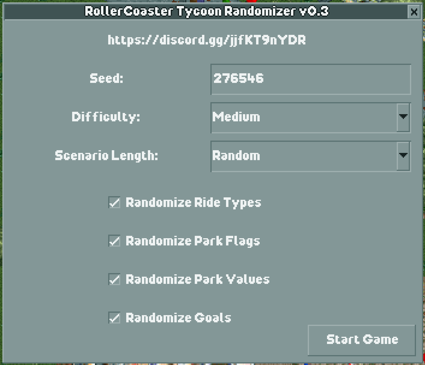 RollerCoaster Tycoon Randomizer mod for RCT1 and RCT2 inside of OpenRCT2.